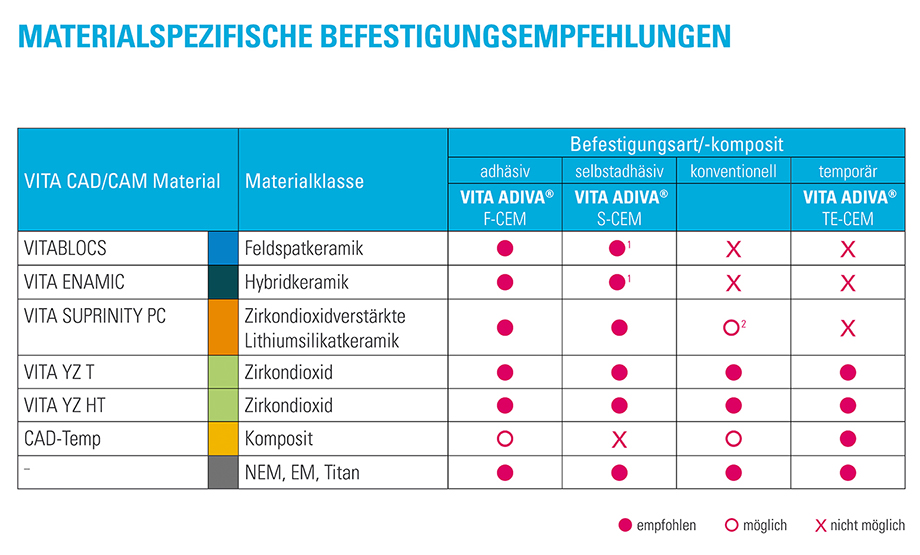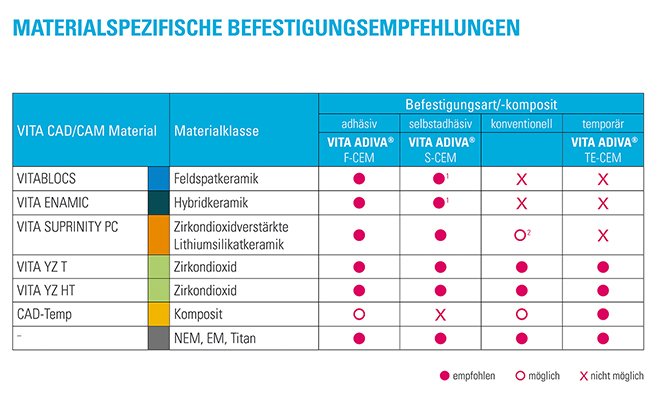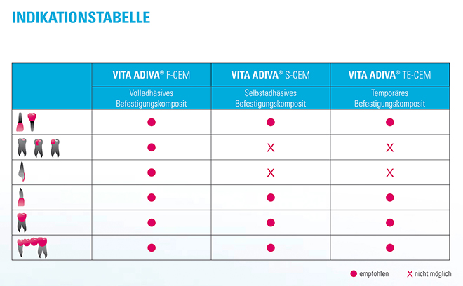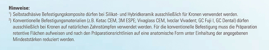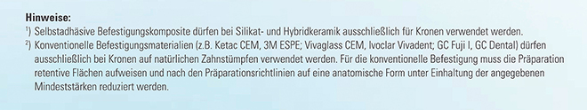 Das volladhäsive Befestigungssystem für die Befestigung aller indirekten Restaurationen aus Feldspat-, Glas- und Hybridkeramik, Zirkondioxid, Komposit sowie Metall geeignet.