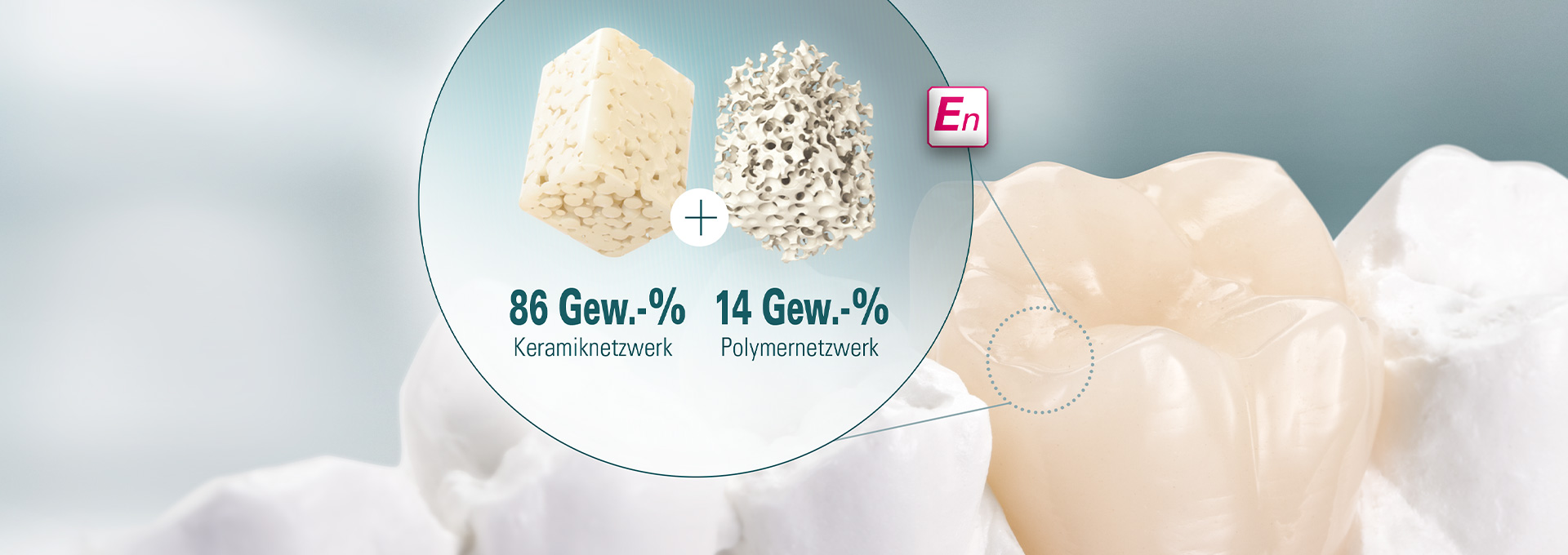 Feldspatkeramik ist hochästhetisch, verfügt über die optischen Eigenschaften natürlicher Zahnhartsubstanz und ist im Vergleich zu reinem Polymer sehr druckfest. Allerdings kompensiert das spröde keramische Material höhere Kaukräfte nicht durch eine elastische Verformung, die sich nach der Krafteinwirkung wieder zurückbildet. Dazu sind wiederum Polymere in der Lage. Sie sind im Vergleich zu Keramiken sehr zugfest und daher äußerst elastisch. Die Verbindung dieser beiden unterschiedlichen Werkstoffe in einem Netzwerk, macht VITA ENAMIC aus.
