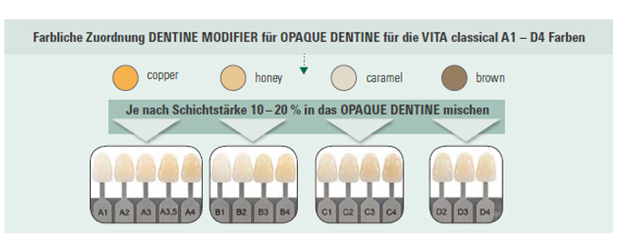 - Für ein kräftigeres Chroma werden 10 – 20 % DENTINE MODIFIER als Zusatz im OPAQUE DENTINE empfohlen (Farbzuordnung siehe Grafik)