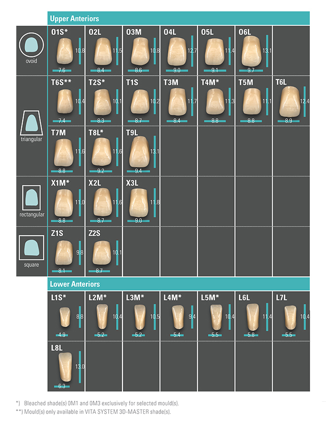 - 21 x Anteriores Oberkiefer Formen (eingeteilt in vier Formengruppen)