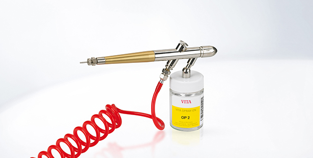 VITA SPRAY-ON wird zum Aufsprühen dentalkeramischer Pulveropaker auf Metallegierungs- und Titangerüste verwendet. Mittels einer an Druckluft angeschlossenen Sprühpistole wird der Opaker gleichmäßig aufgetragen. Angemischte Grundmassen können bis zum vollständigen Verbrauch in den mitgelieferten Glasflaschen aufbewahrt werden. Für den Anschluß an Absauganlagen sind Schablonen mit verschiedenen Radien beigelegt.