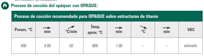 - No es necesario, pero sí posible, utilizar un adhesivo para titanio.* Para lograr una mejor humectación de la superficie de titanio se puede mezclar opcionalmente con el OPAQUE aproximadamente un 50 % de VITA AKZENT PLUS GLAZE LT. Para el mezclado de OPAQUE debe utilizarse el VITA VM OPAQUE FLUID (BVMOF50, BVMOF250).