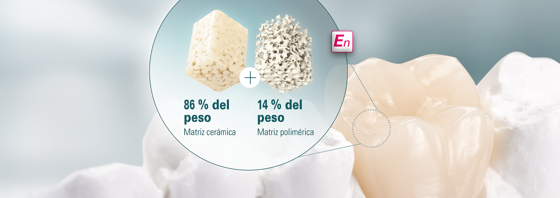 La cerámica de feldespato es altamente estética, posee las propiedades ópticas de la sustancia dental dura natural y es muy resistente a la presión en comparación con el polímero puro. Sin embargo, el material cerámico quebradizo no compensa las fuerzas masticatorias intensas mediante la deformación elástica, como sí hacen los polímeros. La combinación de estos dos materiales distintos en una misma matriz es lo que distingue a VITA ENAMIC.