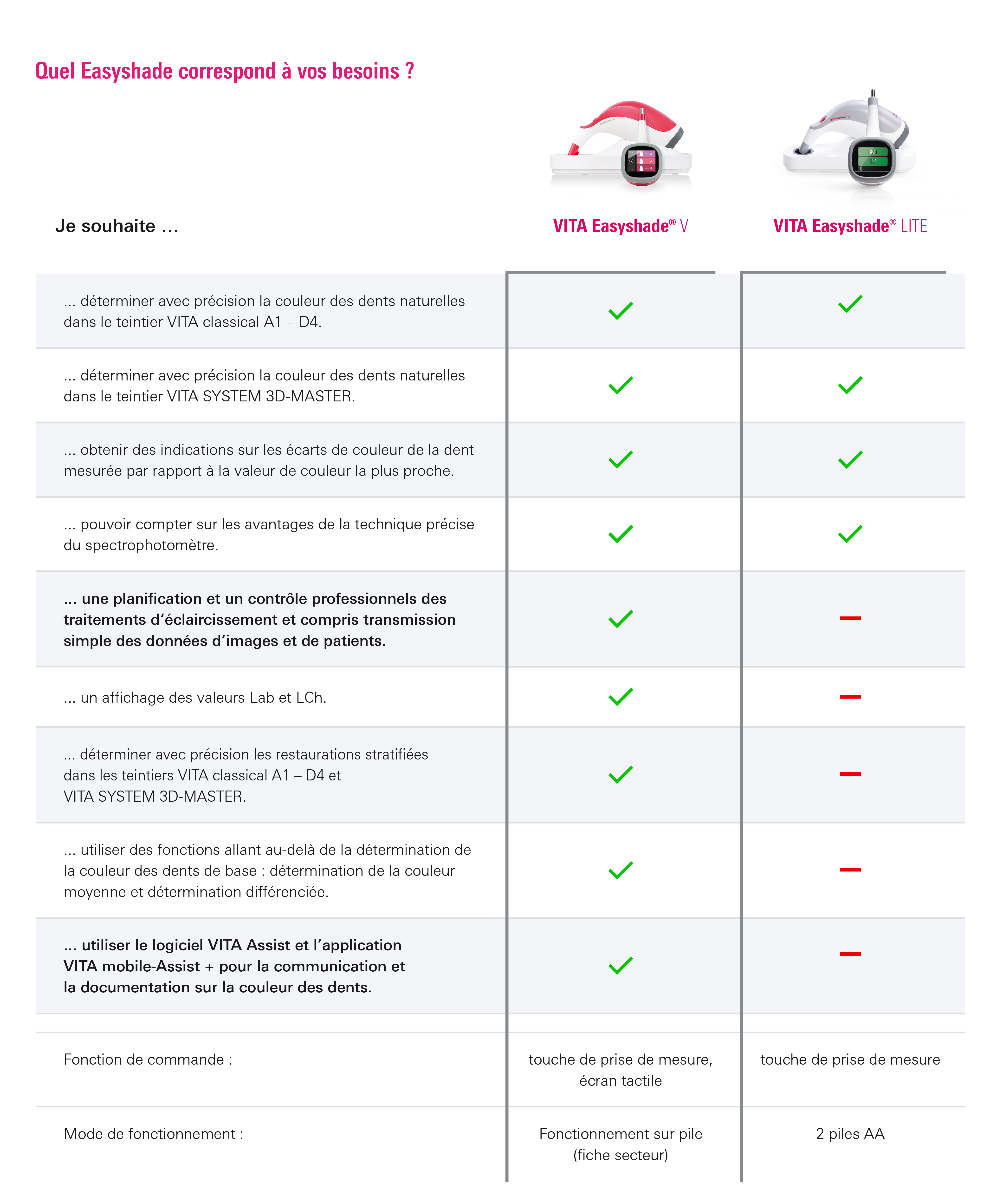 Avec le VITA Easyshade LITE, vous déterminez la couleur naturelle de la dent rapidement, facilement et avec précision. Le VITA Easyshade V offre encore plus de possibilités. Quel Easyshade correspond à vos besoins ?
