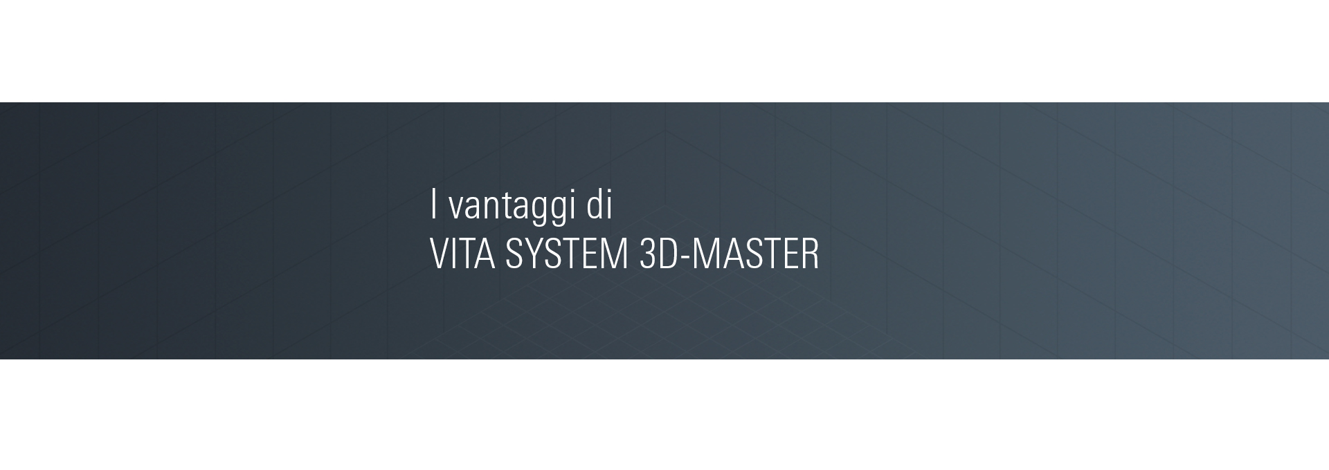 Fisicamente, i colori sono definiti dalle 3 dimensioni di luminosità, intensità cromatica e tinta. VITA SYSTEM 3D-MASTER si basa su questa classificazione scientifica e copre l'intera gamma cromatica naturale dei denti con 26 colorazioni. Il sistema offre quindi un'elevata sicurezza di processo, dalla determinazione precisa del colore fino al restauro finale.